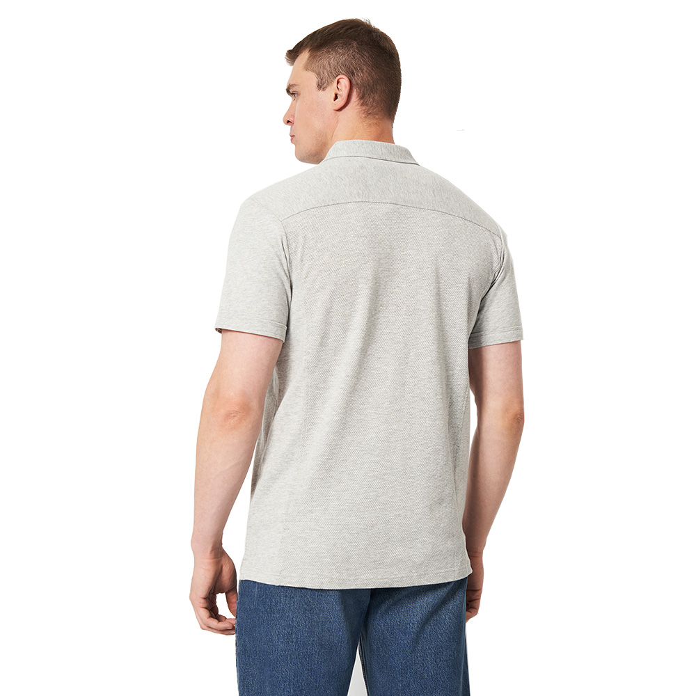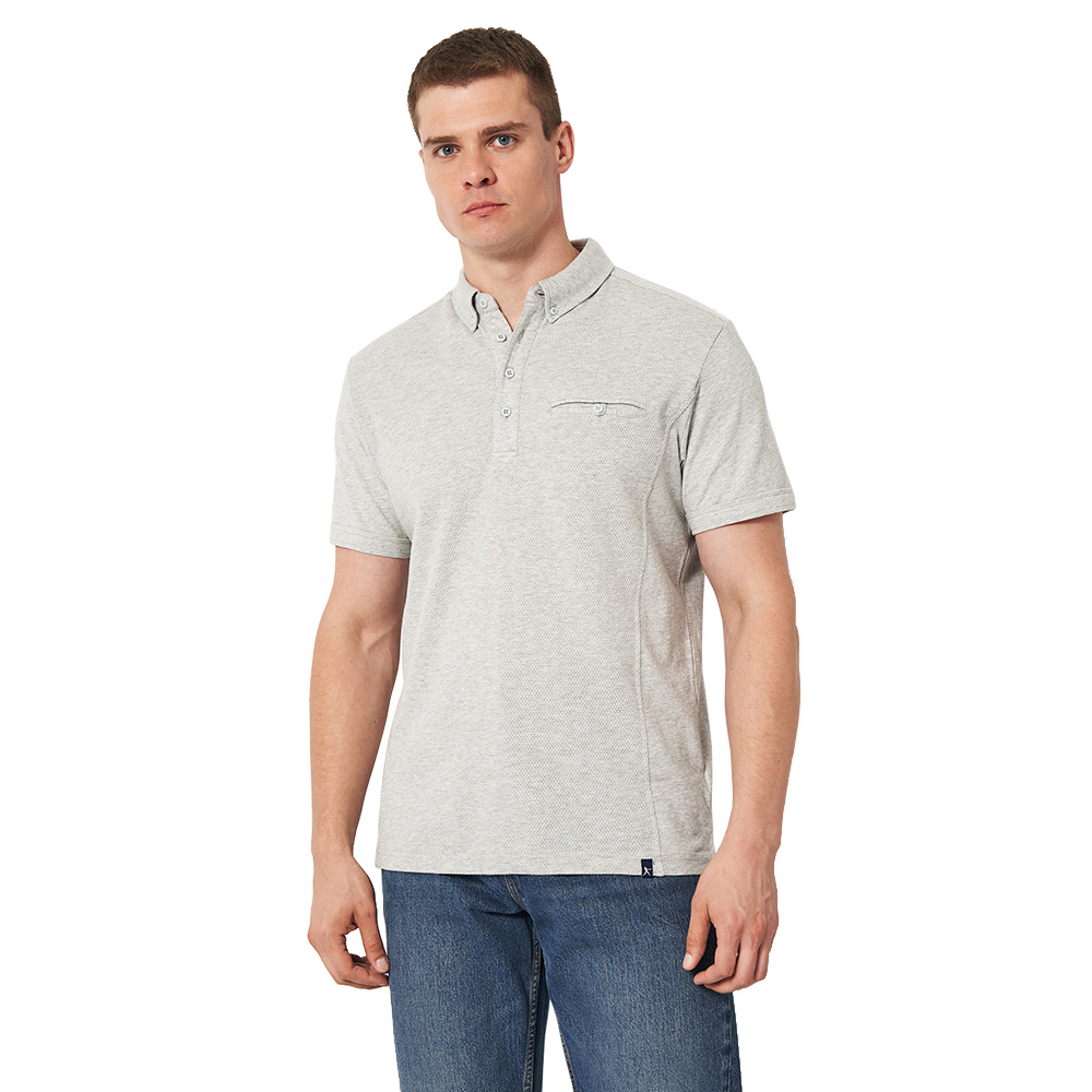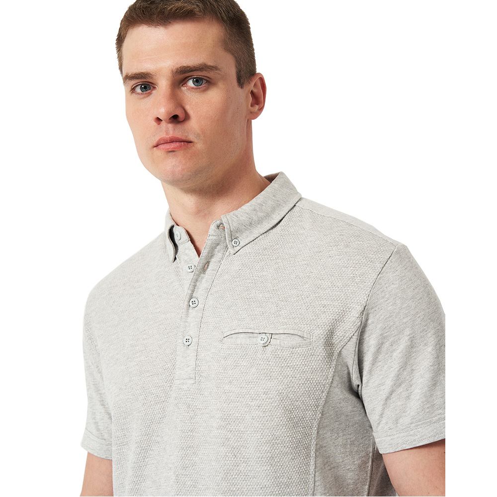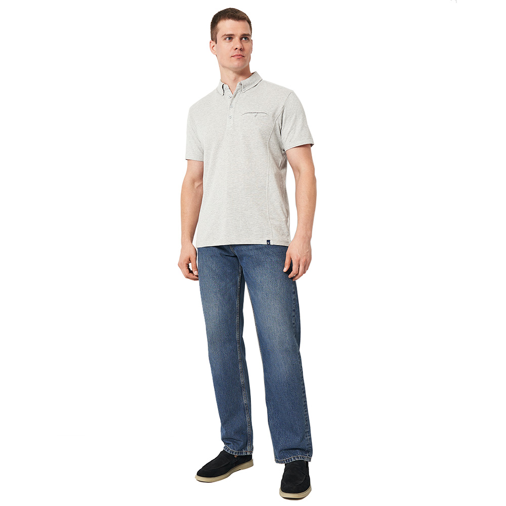 Стильна чоловіча футболка поло Shellden з бічними розрізами. Комір на ґудзиках, нагрудна врізна кишеня на гудзику. Жаккард спереду і ззаду з плоскою трикотажної тканини.